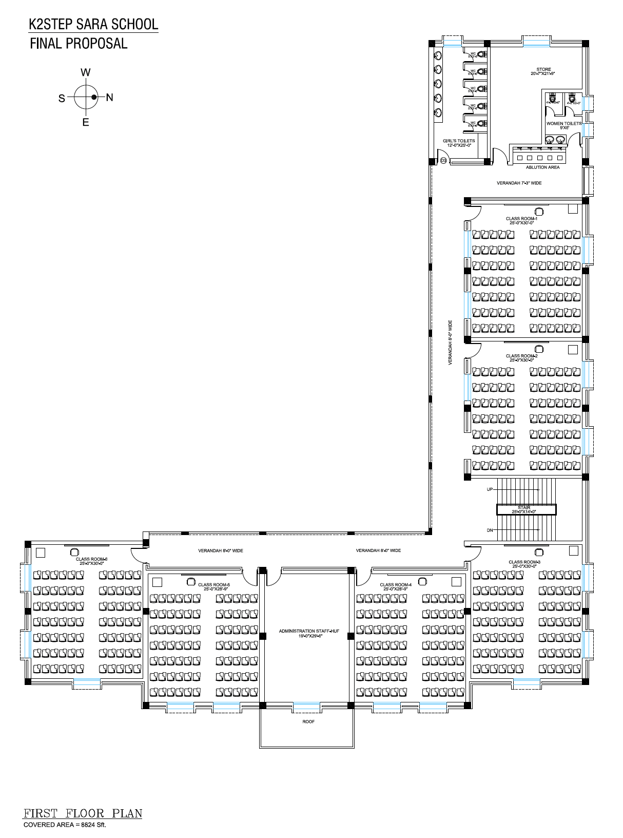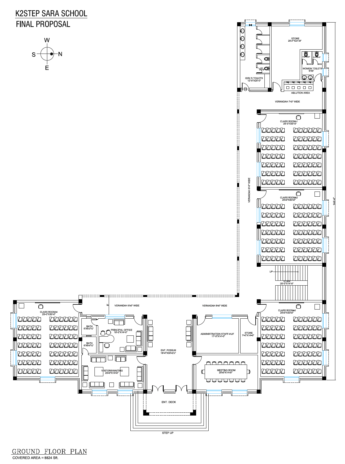 Ground floor schematic. 4 classrooms, administrative offices, restroom.
